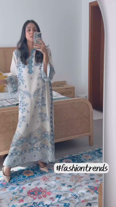 Designed in a soothing cream-beige base with soft blue botanical motifs, the print adds a calming, feminine charm. Border detailing along the sleeves and hem elevates the silhouette, making it visually striking without feeling loud. Paired with matching straight-fit trousers, this set creates a complete coordinated look that blends modesty, elegance, and contemporary sophistication.