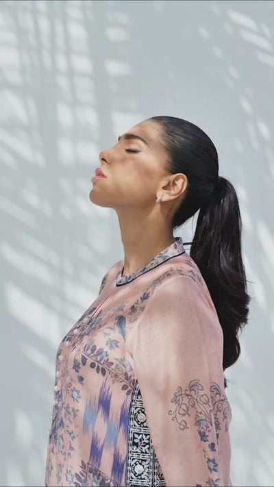 The straight long shirt features intricate lavender floral prints on a blush base, enhanced with embroidered neckline and sleeve borders that add subtle richness without overwhelming the silhouette. Comfortable trousers provide ease of movement, while the flowing embroidered dupatta completes the look with a soft, feminine finish.